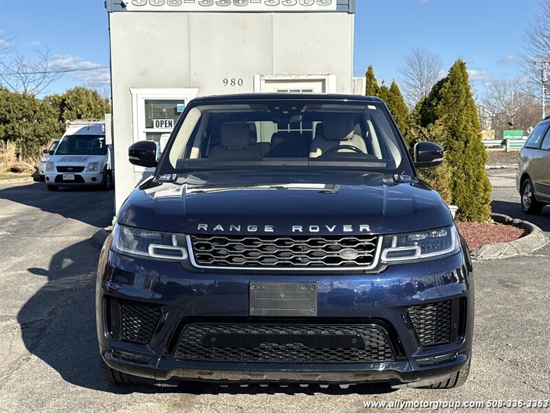 2019 Land Rover Range Rover Sport HSE — Balmoral Blue Metallic exterior with Almond leather interior and Ivory headlining. This Range Rover Sport is powered by the 3.0L supercharged V6 producing 340 hp and 332 lb-ft of torque, paired with an eight-speed automatic transmission and full-time all-wheel drive. The vehicle has excellent overall condition with just under 52,000 miles (averaging under 7,000 miles per year) and EPA ratings of approximately 17 MPG city and 23 MPG highway.